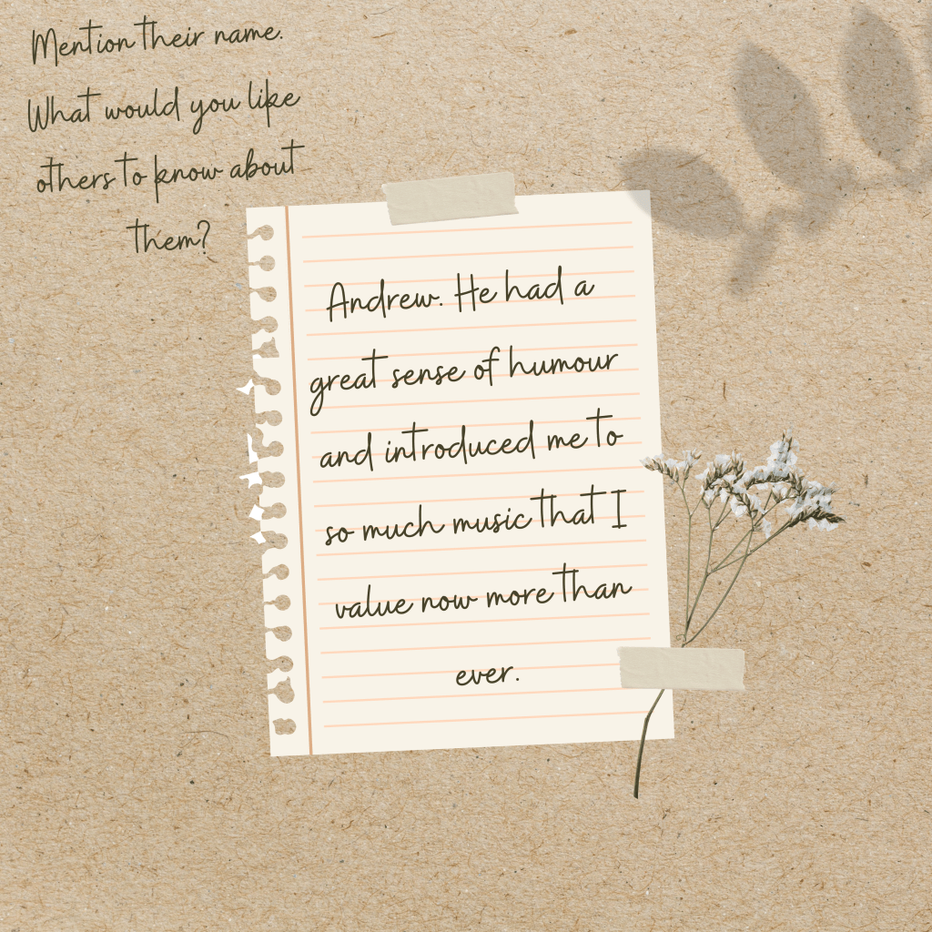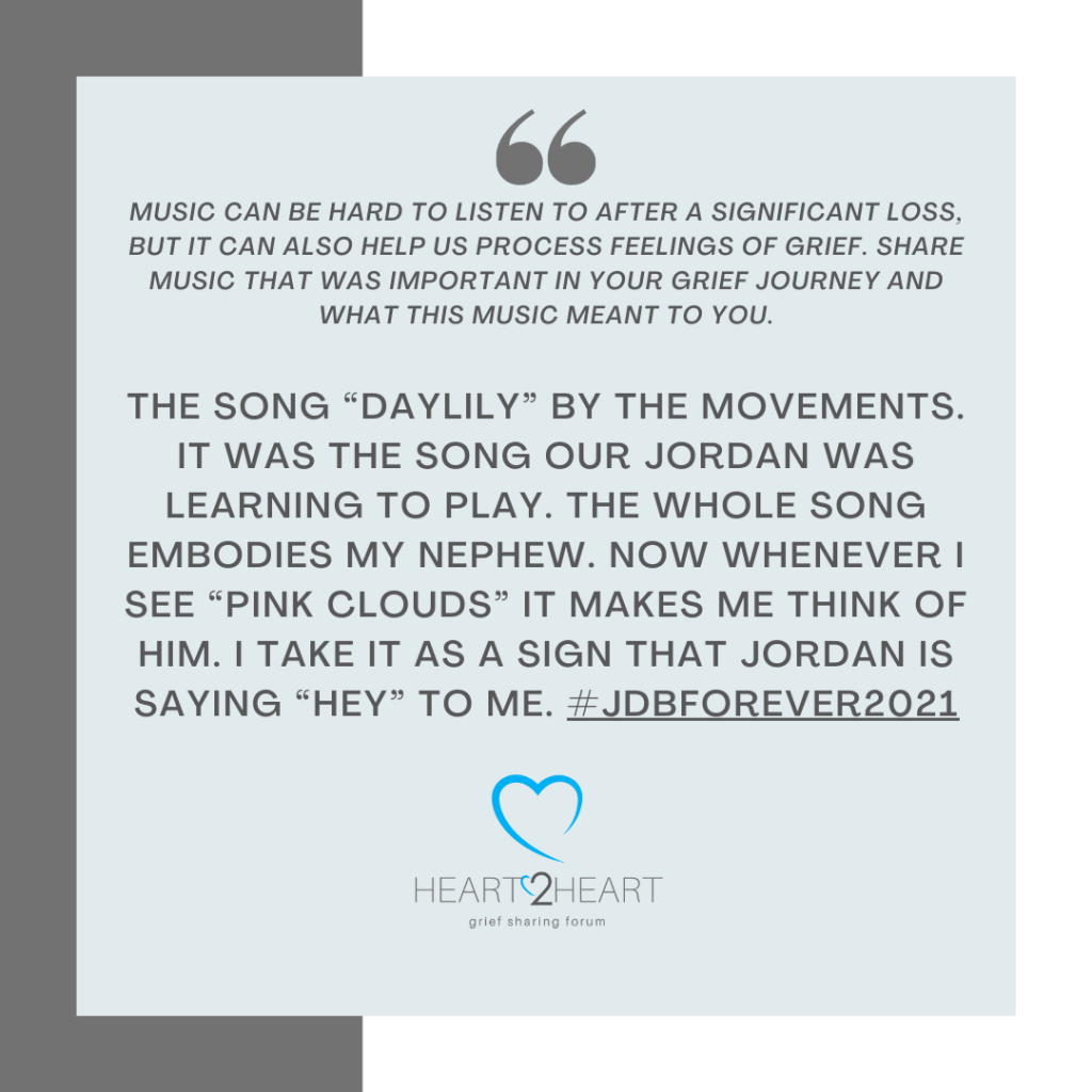 Music can be hard to listen to after a significant loss, but it can also help us process feelings of grief. Share music that was important in your grief journey and what this music meant to you.
